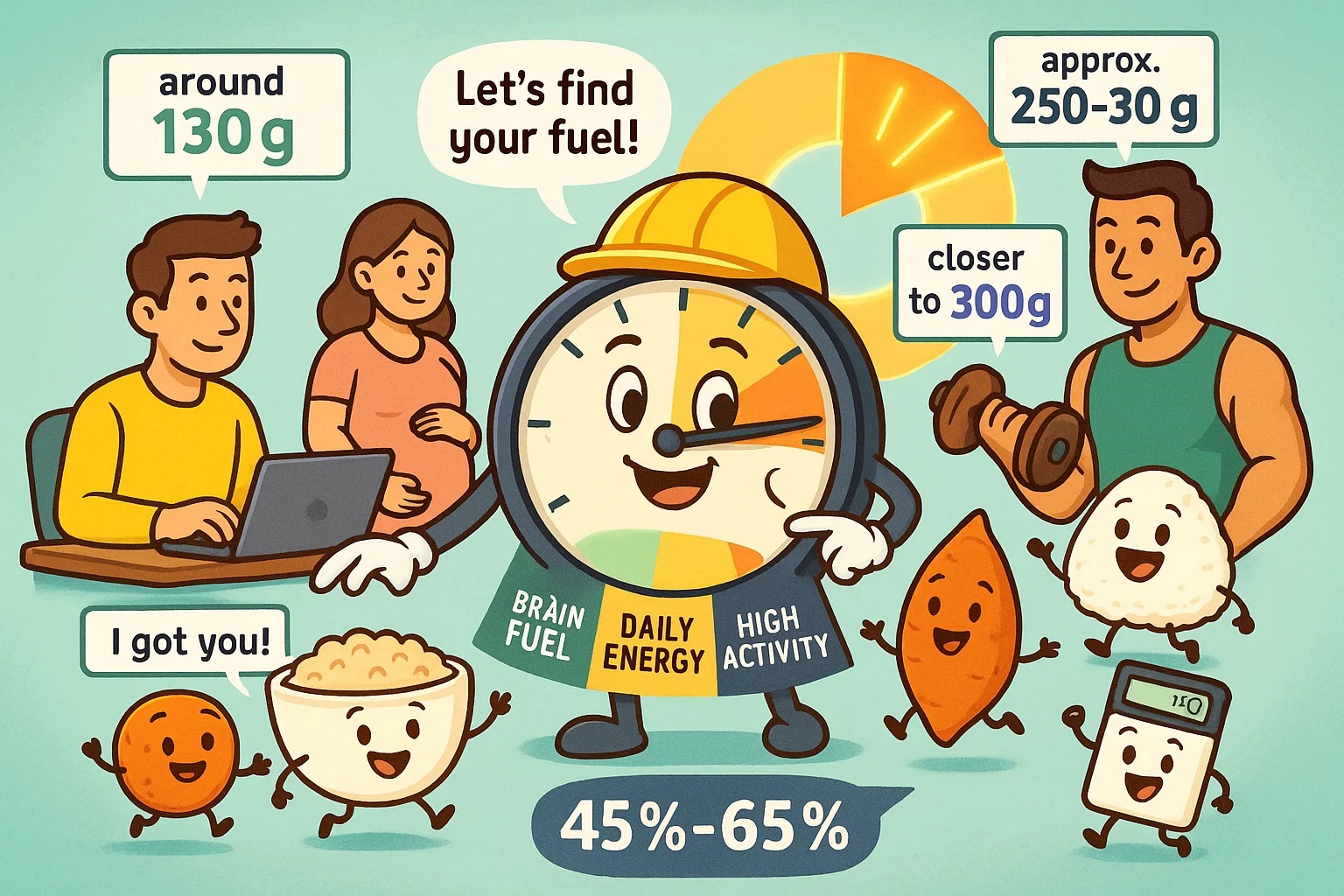 탄수화물 섭취량은 보통 체중, 키, 활동 수준, 목표를 반영한 TDEE (총 일일 에너지 소비량)를 기준으로 계산합니다. 이미 TDEE를 알고 있다면 한 걸음 앞서 있는 셈이며, 모른다면 TDEE 계산기를 사용해 기준을 확인하세요.